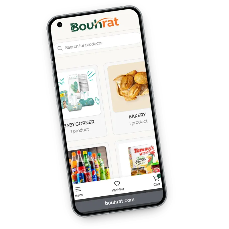 Bouhrat is an online grocery store offering a wide range of food and household products—frozen items, canned goods, snacks, cooking essentials, and vegan/halal options. The site is bilingual (English/Arabic), with standard shop features like categories, cart and checkout, secure payment, and home delivery.